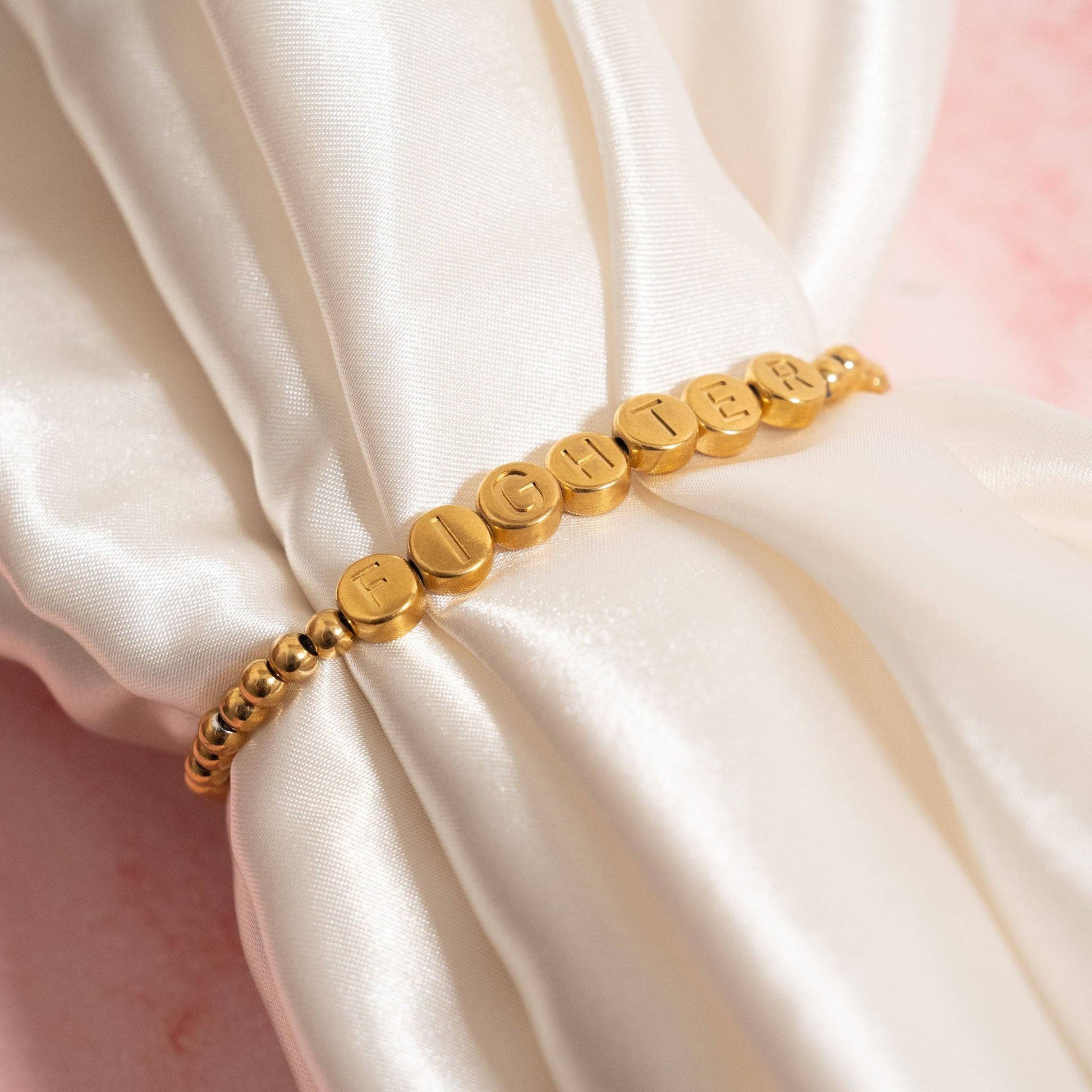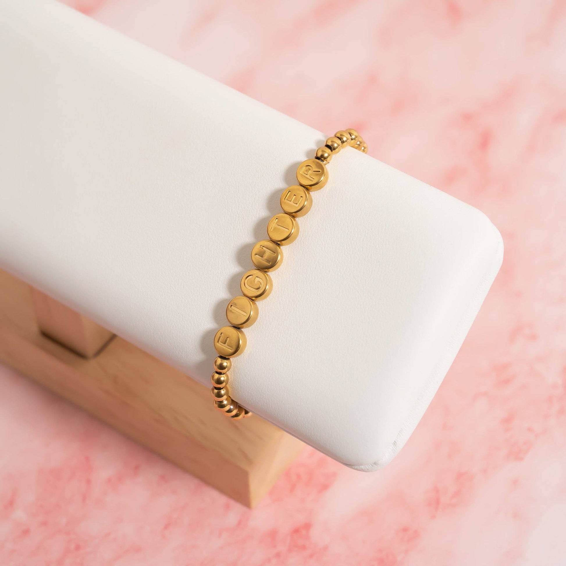 Show your strength with confidence. This striking bracelet showcases polished 18K Gold PVD stainless steel beads on a sturdy stretch cord, ensuring a comfortable and flexible fit. Central to the design is a “Fighter” charm, engraved to symbolize resilience, courage, and determination. Perfect for honoring your personal journey or supporting a cause, this bracelet offers a meaningful message combined with versatile everyday wear. Fully waterproof, resistant to tarnish, and hypoallergenic for lasting comfort.