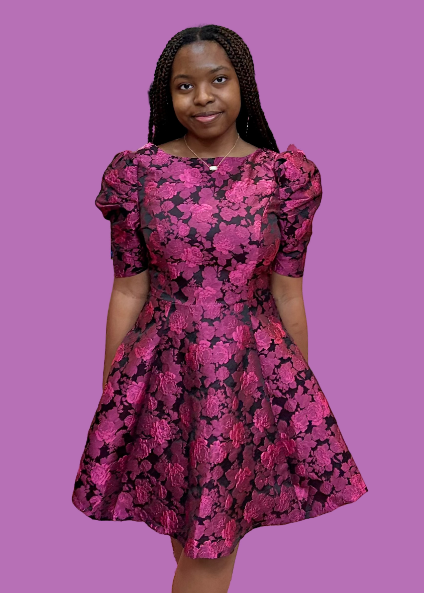 Step into the spotlight with the Fuchsia Jacquard Bloom Dress—a show-stopping piece that commands attention at every event. This luxurious mini dress combines timeless elegance with modern flair, featuring a flattering fit-and-flare silhouette that celebrates your silhouette. The eye-catching jacquard weave showcases a bold floral pattern in striking fuchsia and black, while puff sleeves and a refined neckline add sophisticated dimension. A scooped back and zipper closure complete the polished look. Approximately 34" in length. Perfect for those moments when you want to feel absolutely unforgettable.