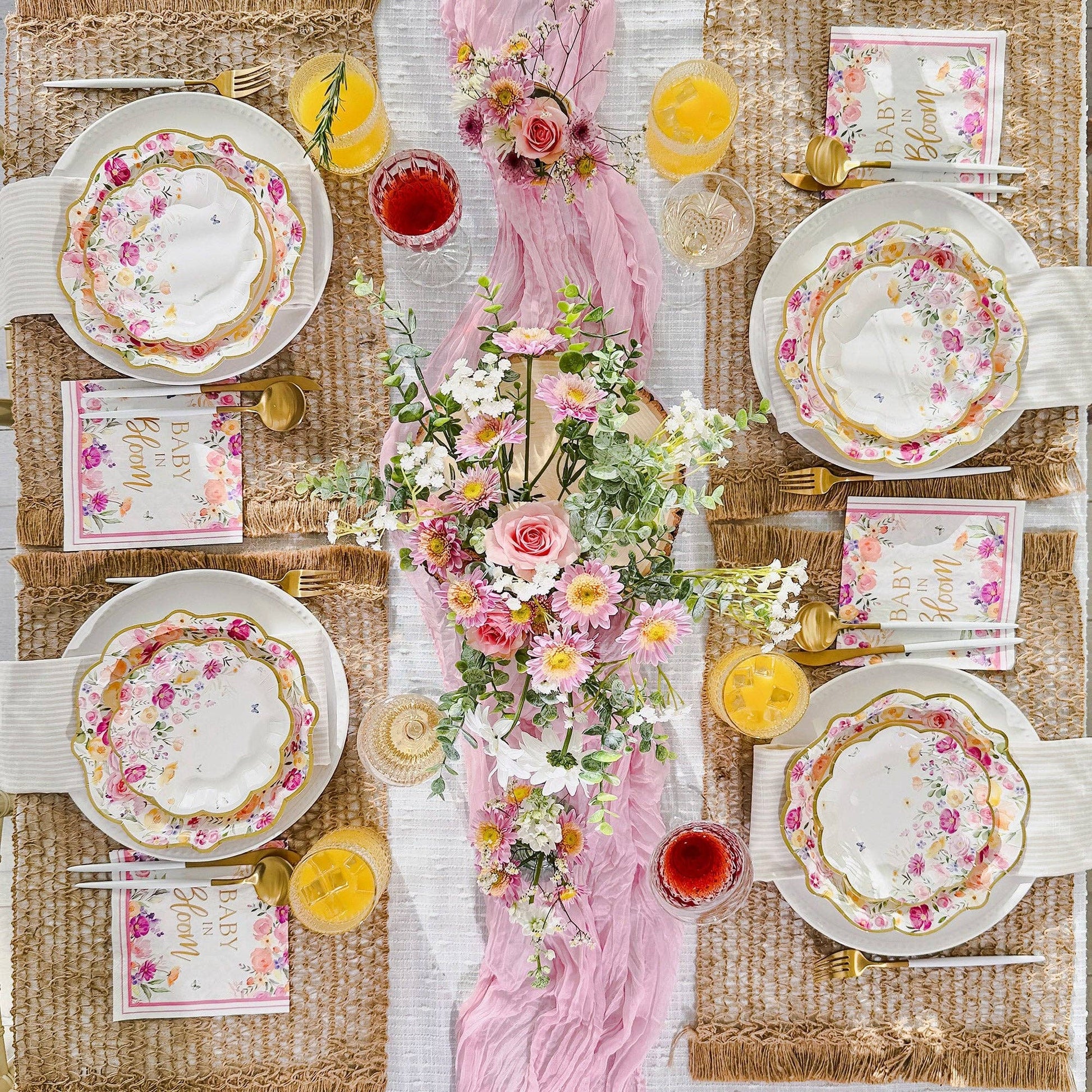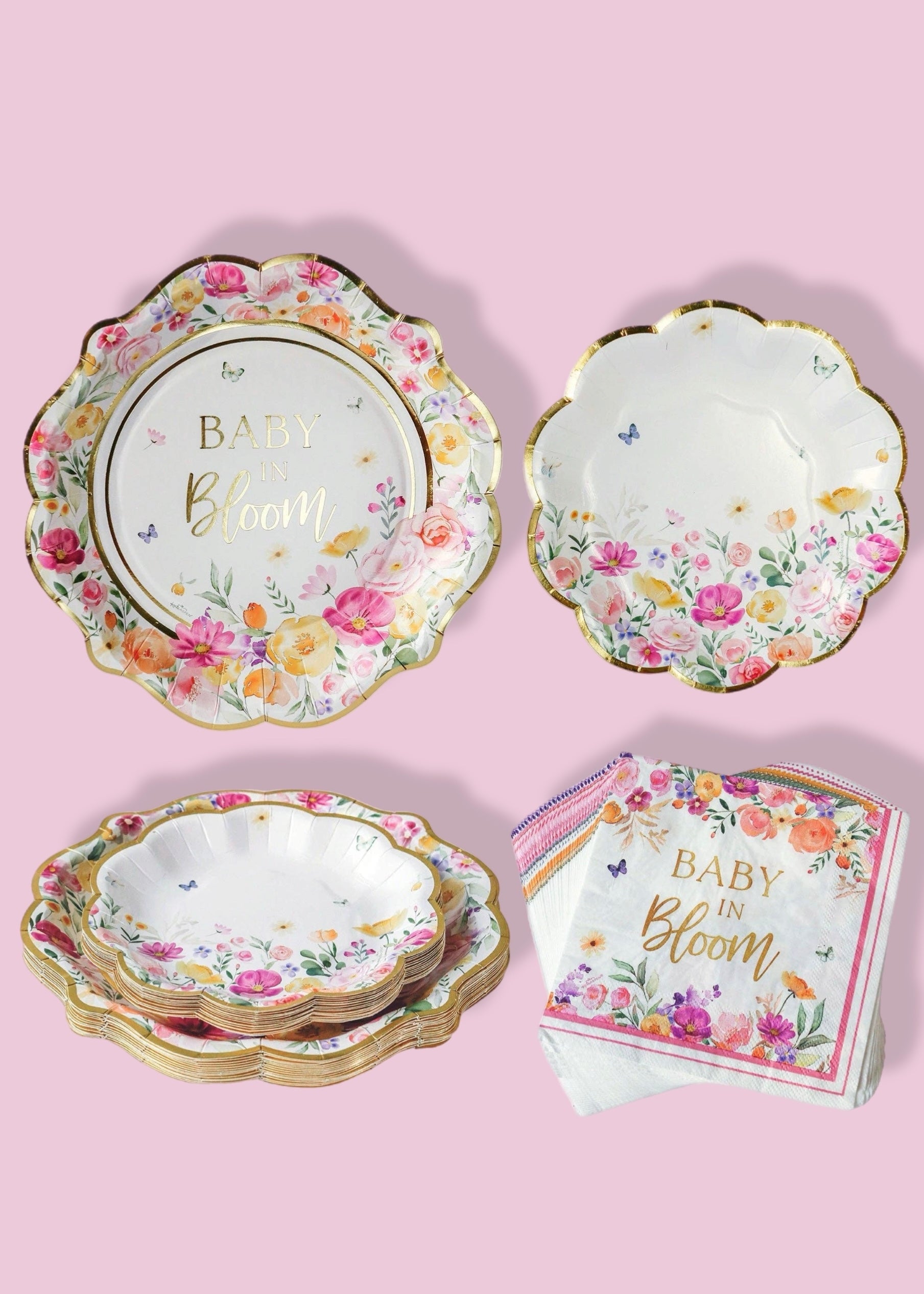 Baby in Bloom Tableware Set is a beautifully designed collection theme perfect for both spring and summer baby showers and gender reveal celebrations. This premium paper tableware set includes 16 9” paper plates, 16 7” paper plates, and 30 matching napkins, each thoughtfully designed with beautiful flowers and foliage to bring the gift of spring and the outdoors to your table.