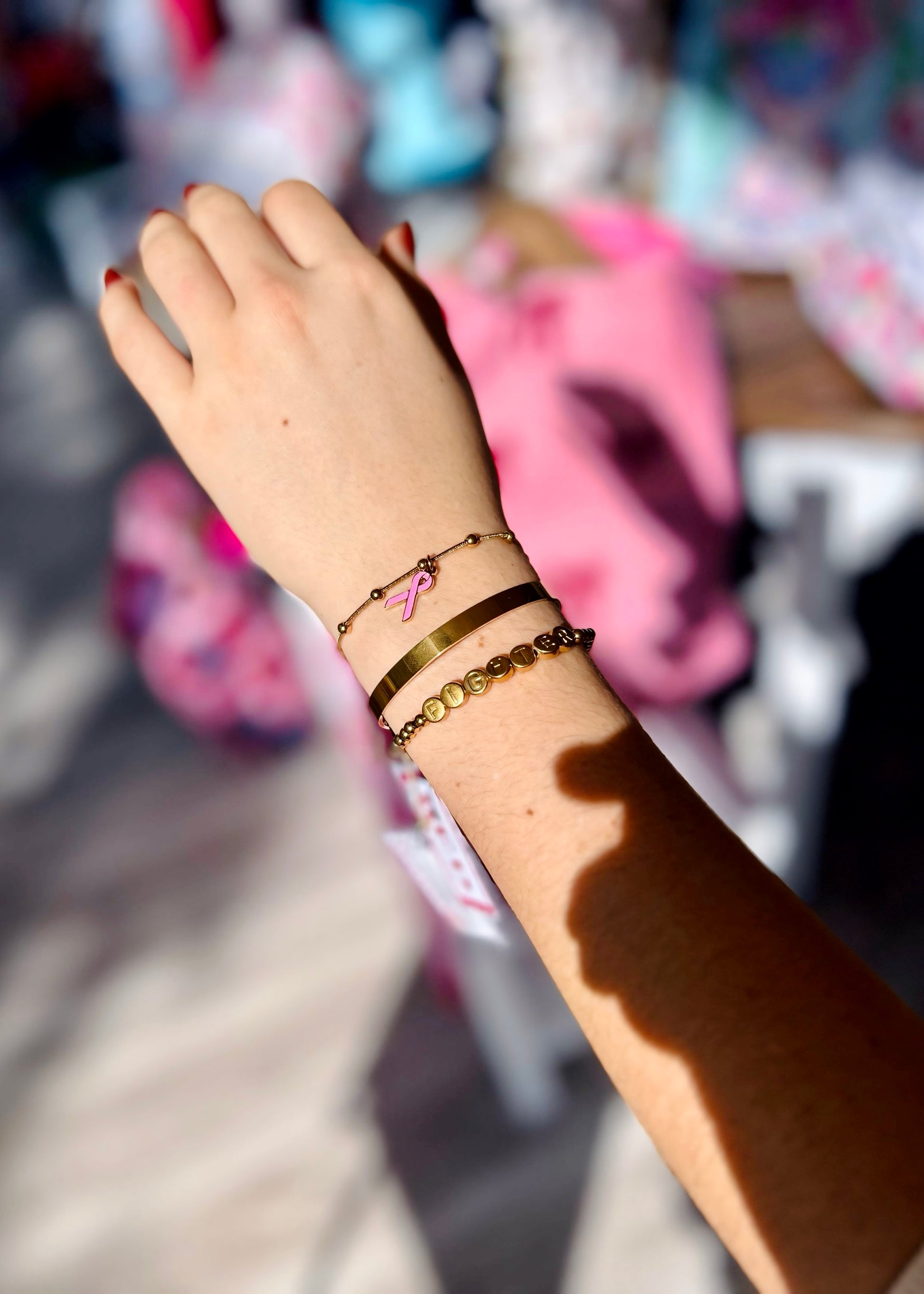Show your support with this stylish adjustable bracelet crafted from 18K gold PVD stainless steel. It showcases a charming breast cancer awareness ribbon, a powerful emblem of love, resilience, and solidarity. Designed for comfort, its adjustable size ensures a perfect fit for everyday wear or a thoughtful gift. Waterproof, hypoallergenic, and resistant to tarnish, this durable bracelet suits all skin types. Measures 10" with a 17mm x 8mm charm, combining meaningful elegance with lasting quality.
