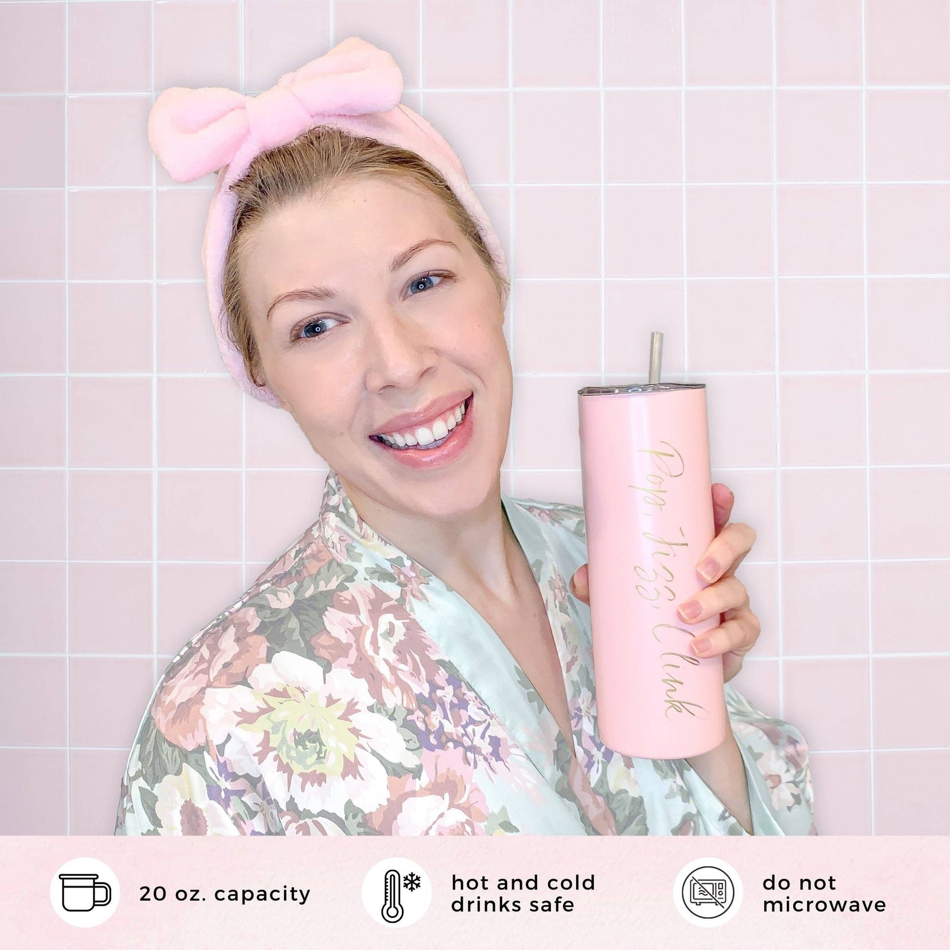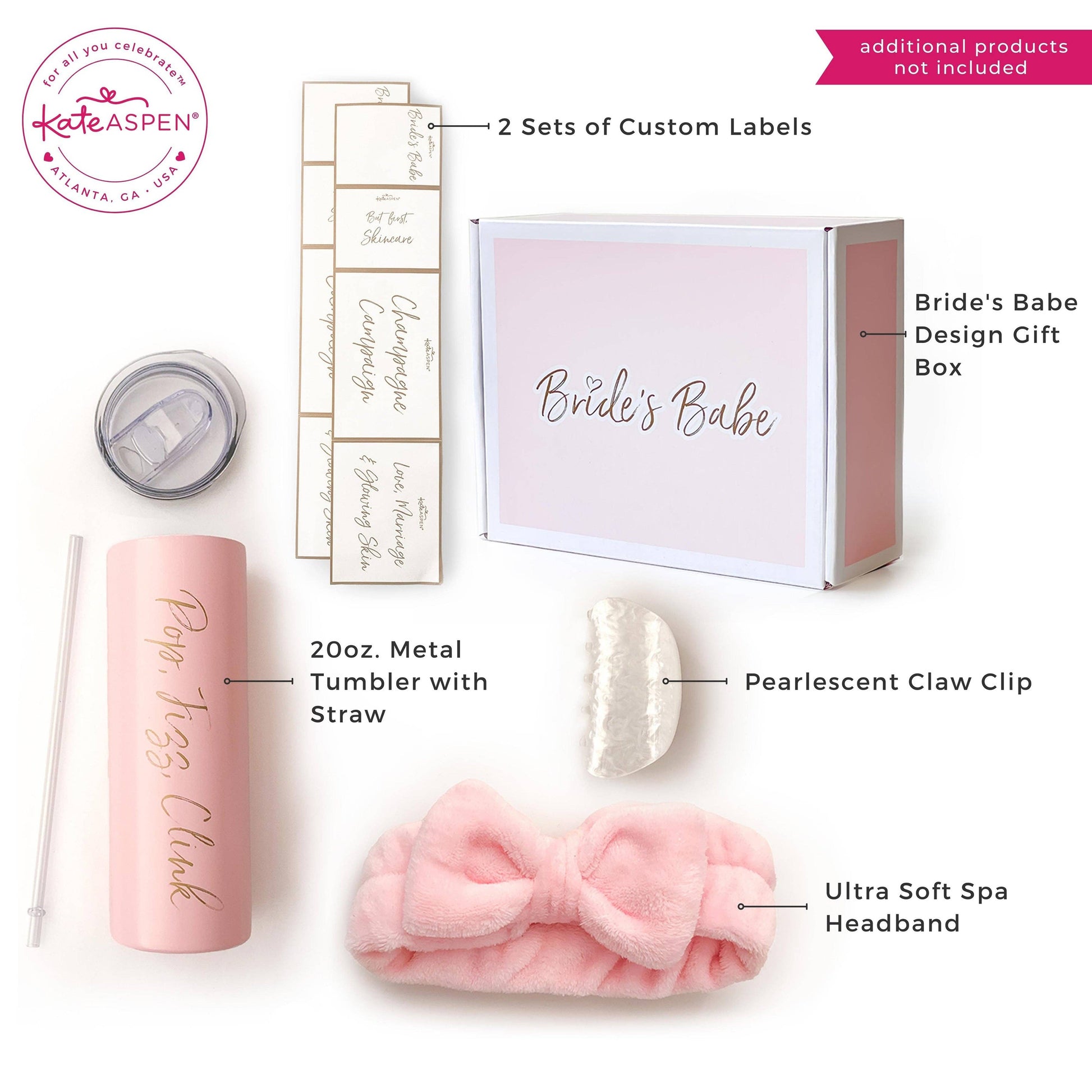 The Bride's Babe Bridesmaid Gift Box Kit is the perfect gift to use to ask your friends and family to be a bridesmaid in your wedding or to give to them on the day of for them to remember such a special time in your relationship. We especially curated the Bride's Babe Bridesmaid Gift Box Kit that features a blush pink box with white edging, an exterior print of "Bride's Babe" and an interior print of "I can't say I do without you". Inside we include a spa headband for all that skin prep before the wedding and a claw clip that we all need more of great for all hair types. A metal tumbler that reads "pop, fizz, clink" down the side that is great for cocktails or mocktails and will keep your drink cold for hours.