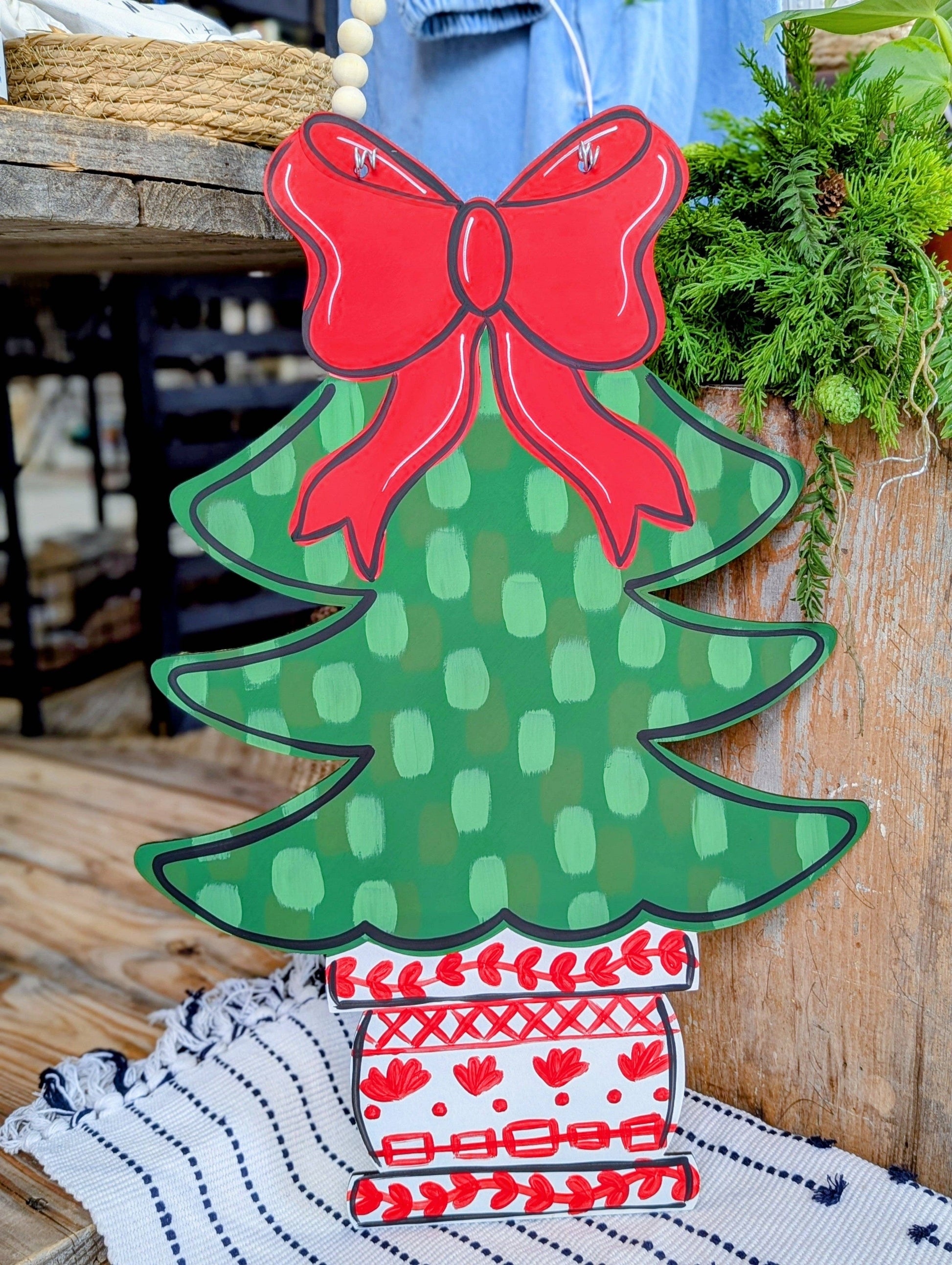 This sign is cut out of 1/4 inch Birch and painted with acrylic paint. It is sprayed with a clear protective coating that prevents chipping, peeling, fading, or yellowing. It hangs from sturdy wire and is accessorized with a bow to match. Every door hanger is hand painted by myself so there may be very slight variations between your actual design and what you see here.
