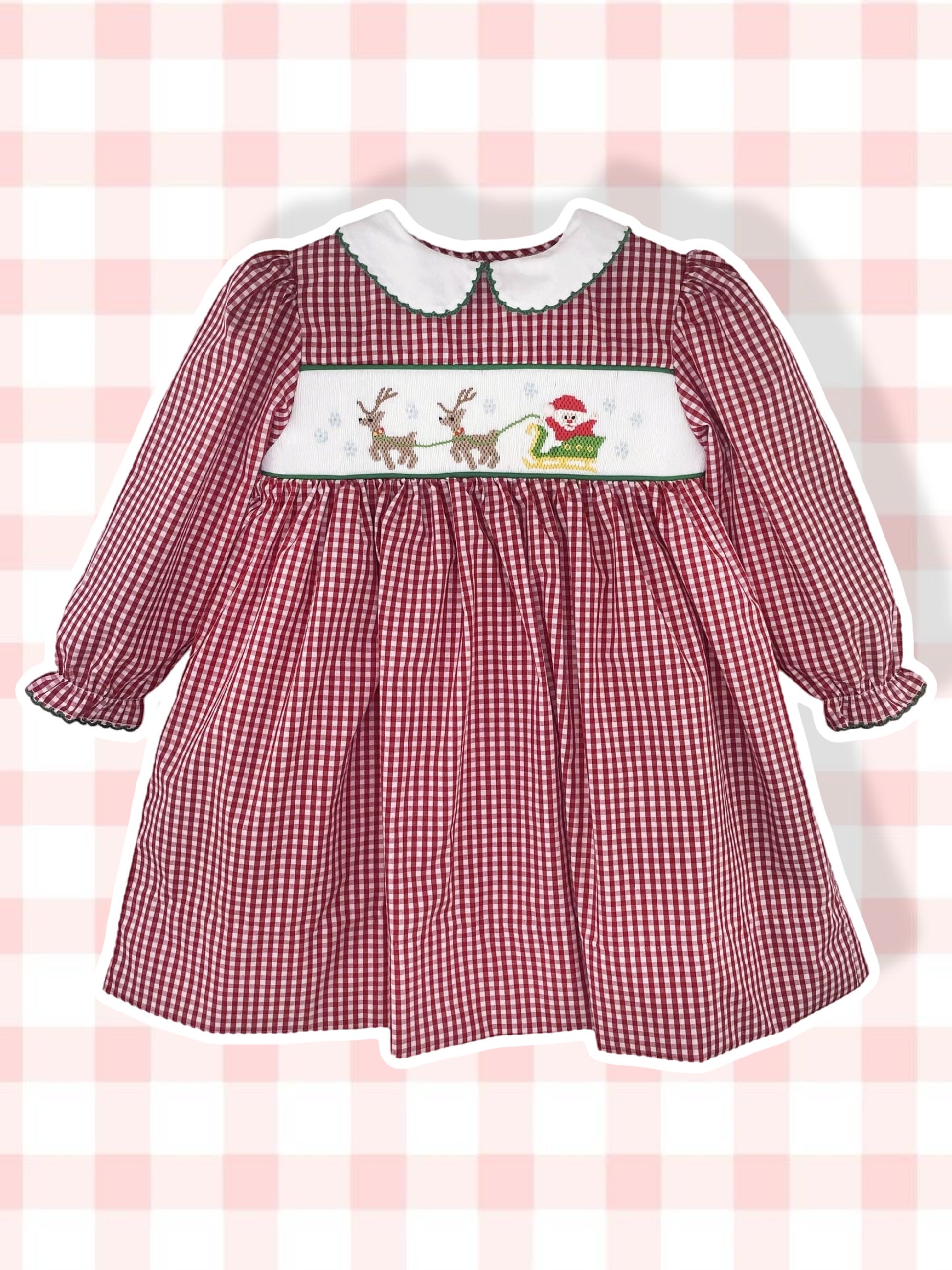 Celebrate the season in timeless elegance with this enchanting Christmas dress. Featuring intricate hand-smocked artistry depicting Santa's magical sleigh ride, this piece transforms holiday moments into cherished memories. The classic red and white check pattern pairs beautifully with a crisp white Peter Pan collar trimmed in delicate green picot edging. Each dress showcases refined craftsmanship that elevates any festive occasion. Sizes 3 months through 24 months include coordinating bloomers for a complete, picture-perfect ensemble. Give your child a heirloom-quality dress that captures the wonder of Christmas.