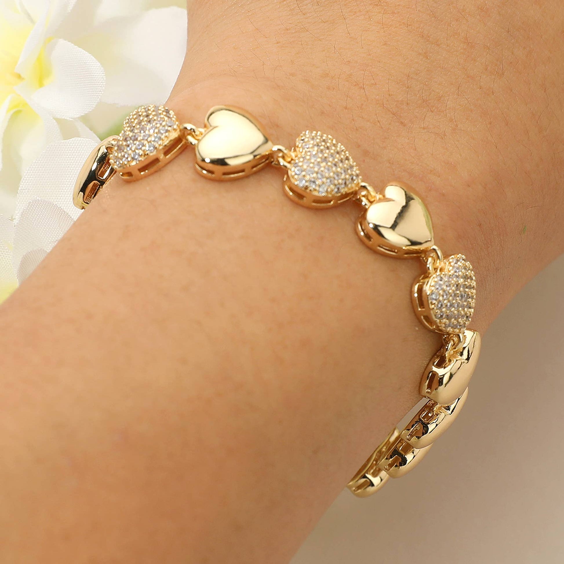 Express timeless romance with this exquisite CZ stone paved heart link bracelet. Crafted from brass with brilliant cubic zirconia accents, this delicate piece measures 0.4" H with a 7.25" length plus 0.3" extender, secured by a reliable fold-over closure. Each polished heart link sparkles with refined elegance, making it the perfect companion for both everyday wear and special occasions. Lightweight yet striking, this bracelet captures the essence of love and sophistication—an ideal gift or cherished addition to any jewelry lover's collection.