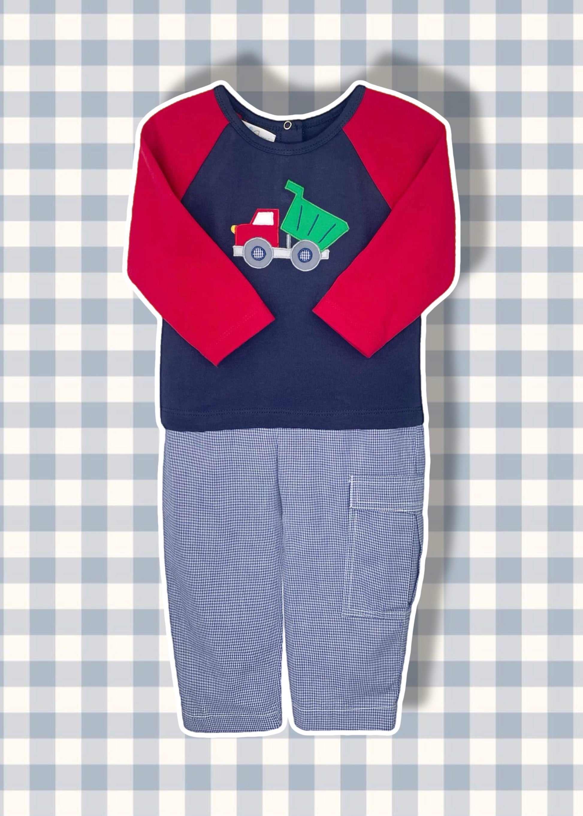 Watch your son's eyes light up in this exciting dump truck outfit. The red and navy long sleeve knit shirt showcases a bold dump truck applique that sparks imagination during playtime or park adventures. Coordinating blue check pants with practical pockets complete the look, making this set ideal for fall and winter wear. Designed with a lightweight cotton blend, the fabric keeps your little one comfortable and unrestricted as he moves and plays. Durable and parent-friendly, simply machine wash and tumble dry for hassle-free maintenance. Outfit your active boy in a set that matches his energy and sense of fun.