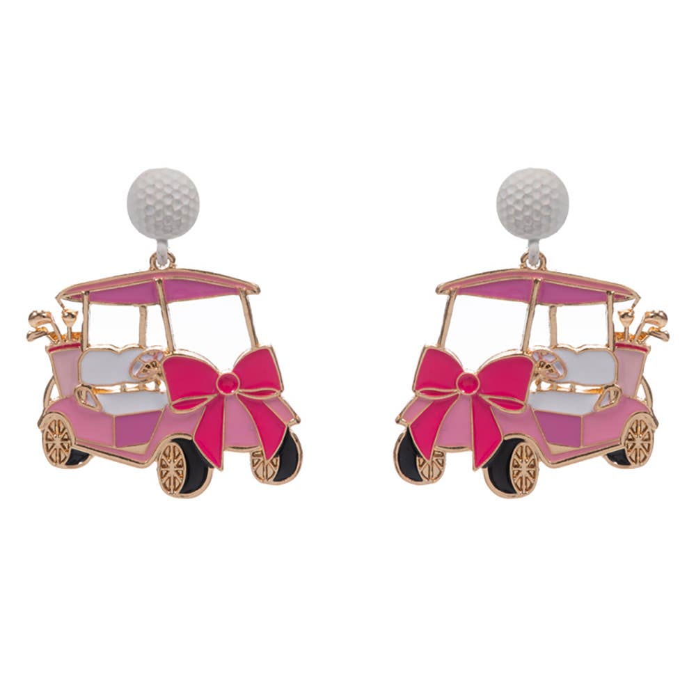 Celebrate your love of the game with these delightful golf cart bow dangle earrings. Crafted with hypoallergenic titanium posts and measuring 1.5" X 1.8", they're comfortable enough for all-day wear. These charming earrings blend playful personality with sophisticated style, making them ideal for golf enthusiasts, themed events, or anyone seeking a conversation-starting accessory. The enamel detailing and whimsical design add just the right touch of fun to elevate your everyday look or make a statement at special occasions.