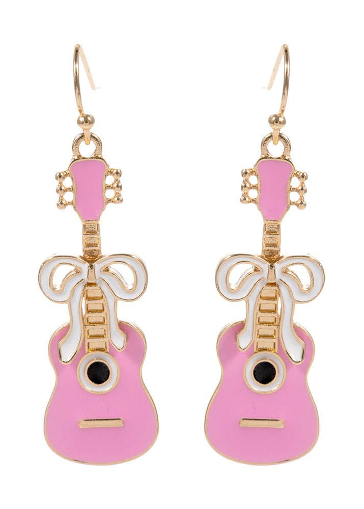 Celebrate your passion for music with these charming Enamel Guitar Bow Dangle Earrings. Featuring whimsical guitar and bow details, these 1.8" drops bring playful artistry to any look. The comfortable brass fish hook backs ensure all-day wearability, while the hypoallergenic construction keeps sensitive ears happy. Perfect for music lovers, festival-goers, and anyone who wants to showcase their creative spirit, these earrings add personality and flair to casual outfits and concert nights alike. Let your love of music shine through with these delightfully unique accessories.