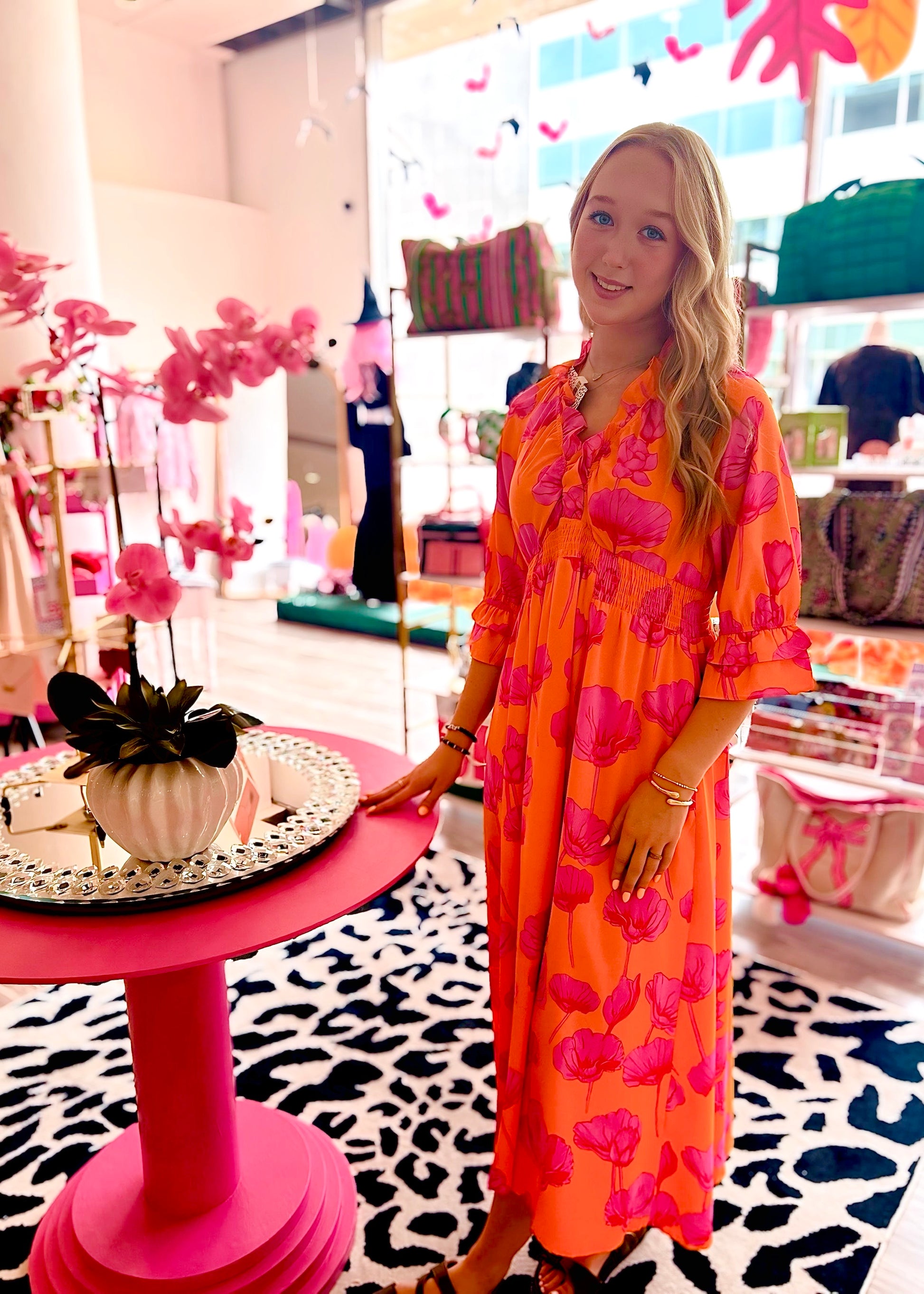 The Floral Frilly Smock Dress, with its flattering V-neck and 3/4 sleeves, showcases a lively blend of orange and pink shades. This beautifully crafted piece offers a feminine and stylish silhouette, ideal for adding a striking and elegant touch to your wardrobe.