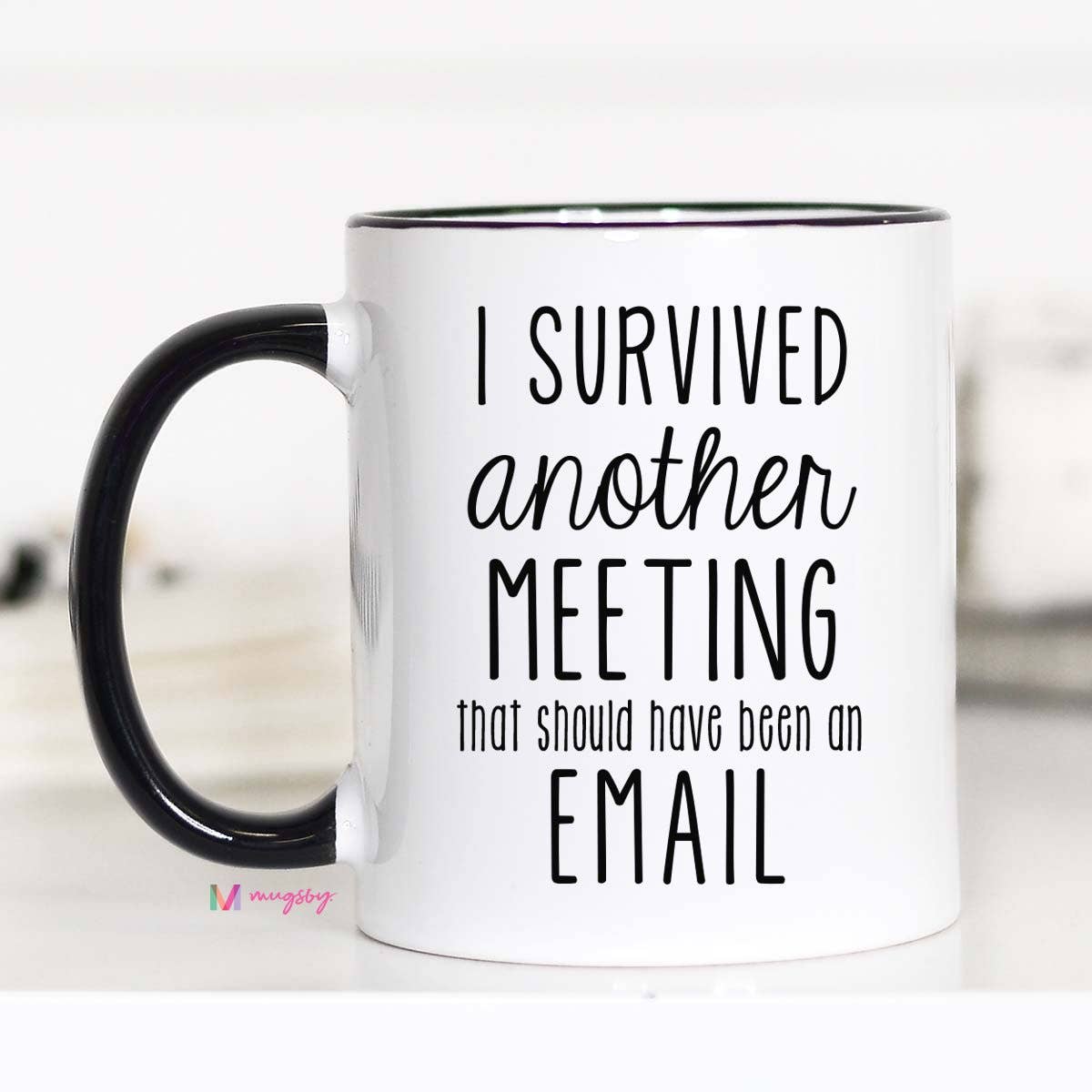 Show off your triumph with this off-white ceramic mug featuring black rim and handle. Printed on both sides, it’s safe for the microwave and top rack dishwasher. Perfect for celebrating your meeting survival with style and convenience.