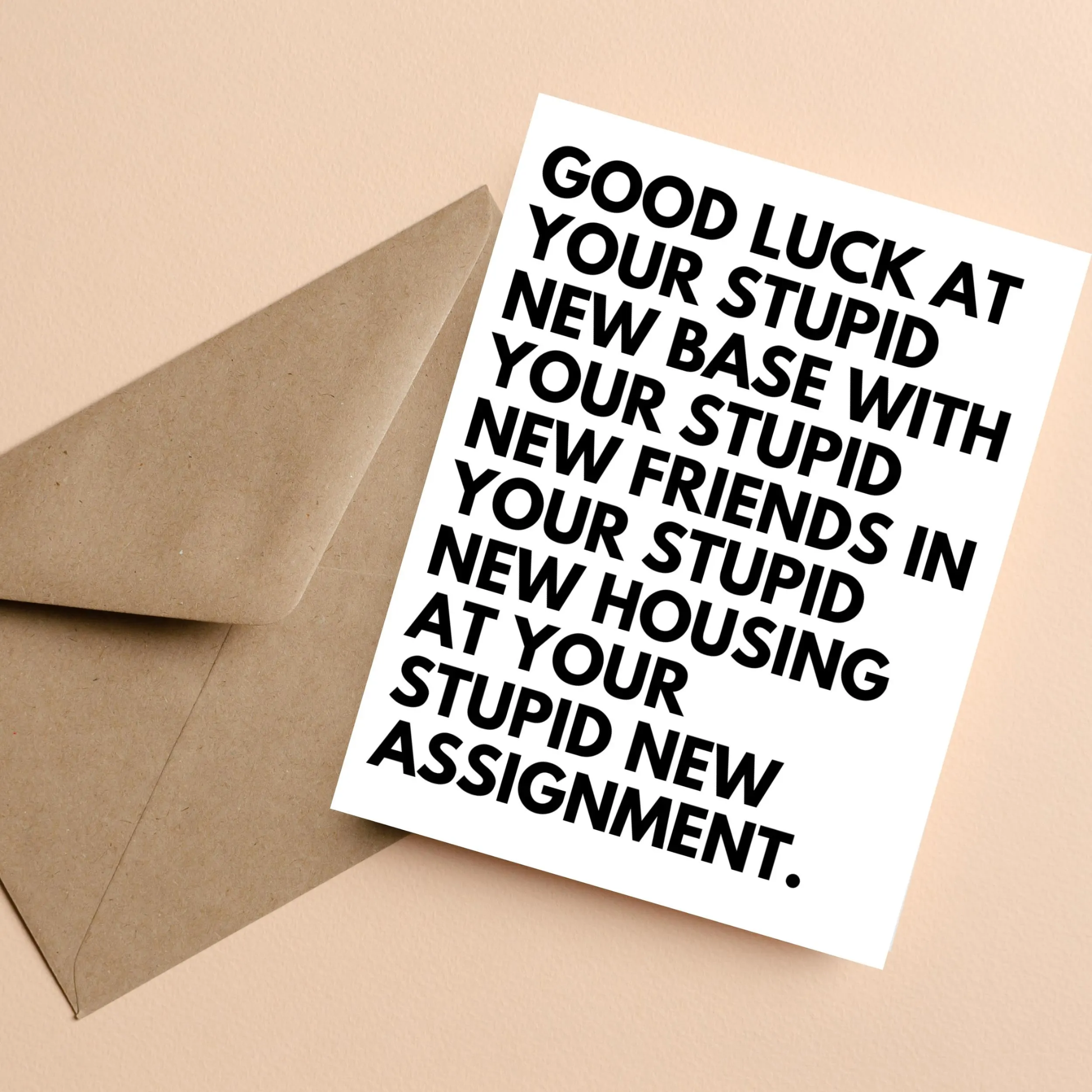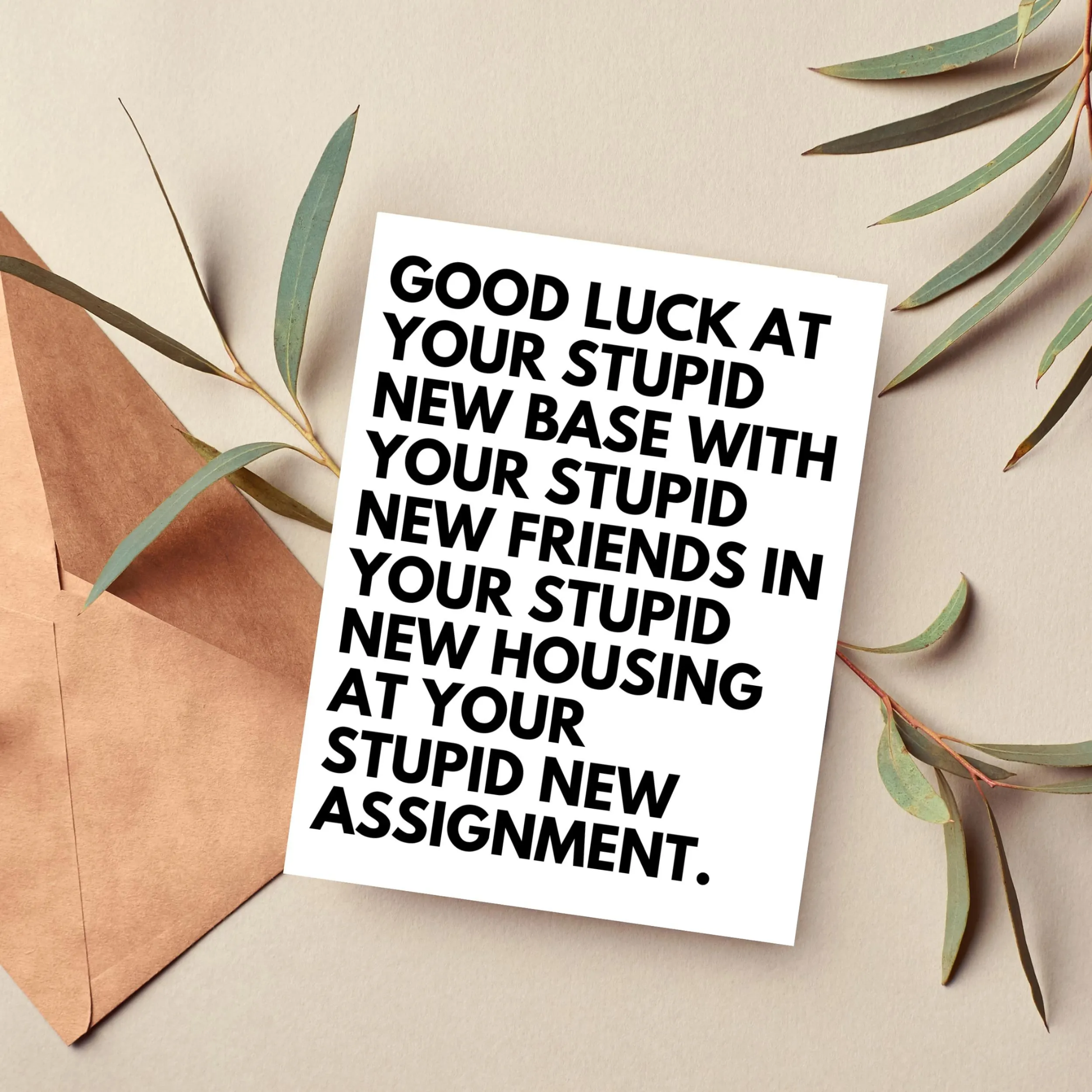 Send off your military friend, partner, or colleague with a card that gets it. Designed for those who understand the constant cycle of hellos and goodbyes, this snarky yet heartfelt greeting speaks directly to the military lifestyle. The A2 format (4.25 x 5.5 inches) features a blank interior, giving you space to add your own message—sincere, silly, or somewhere in between. A kraft envelope completes the package with understated style.