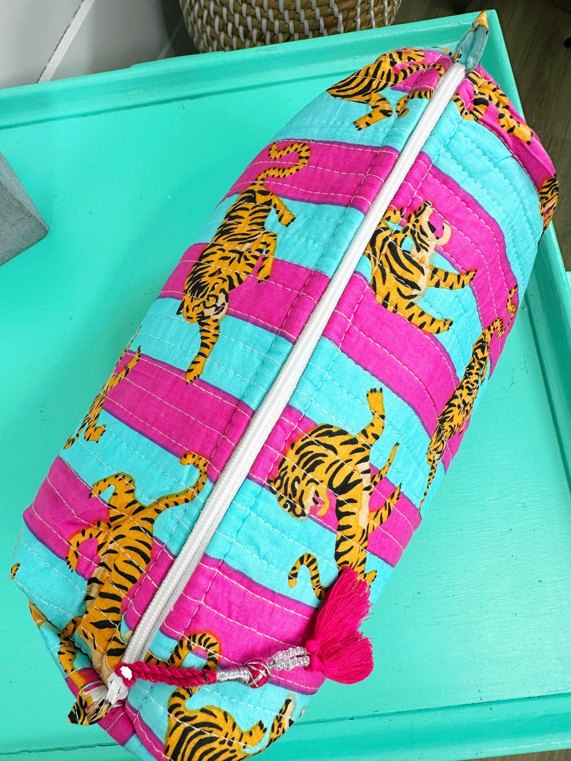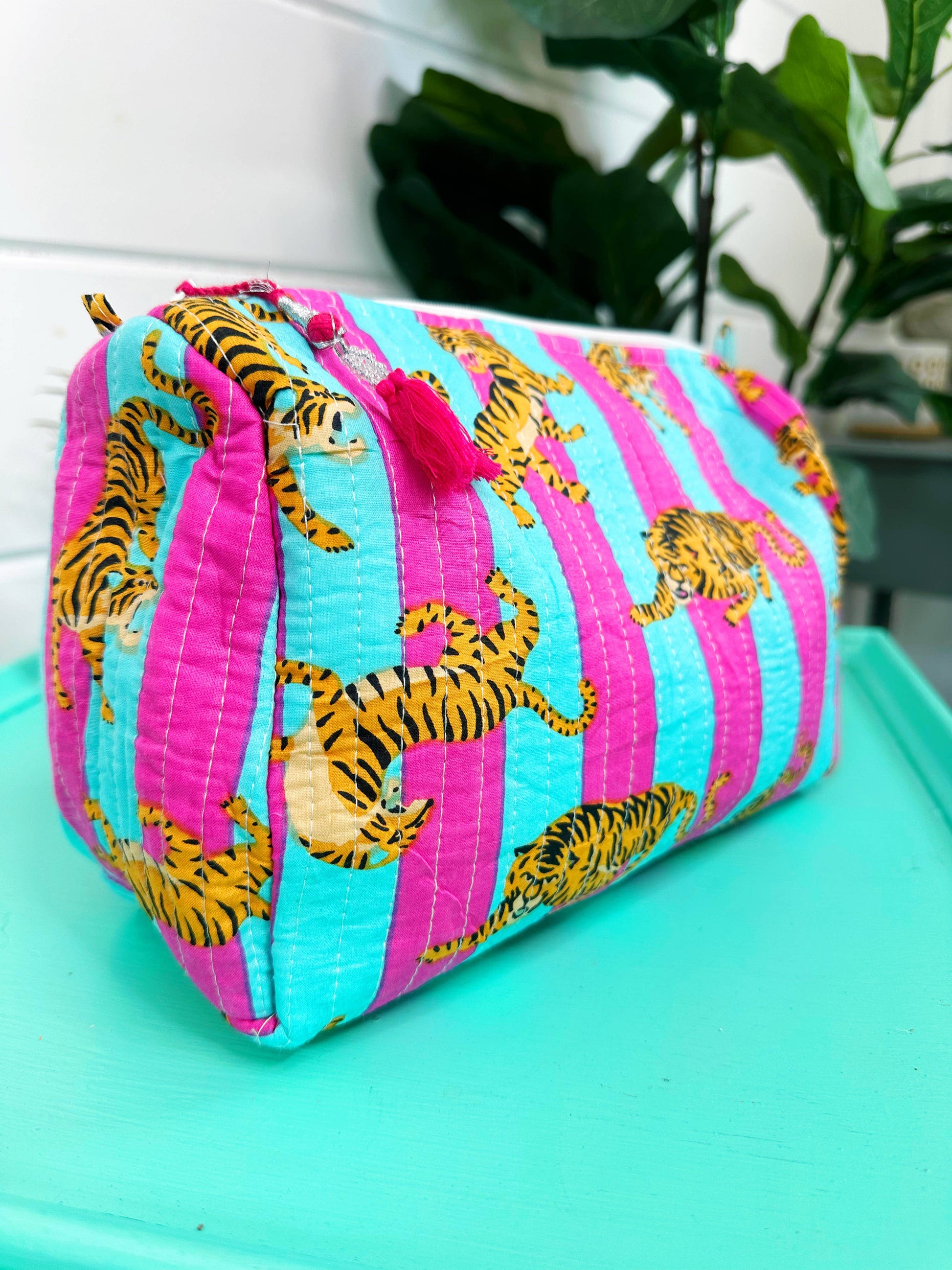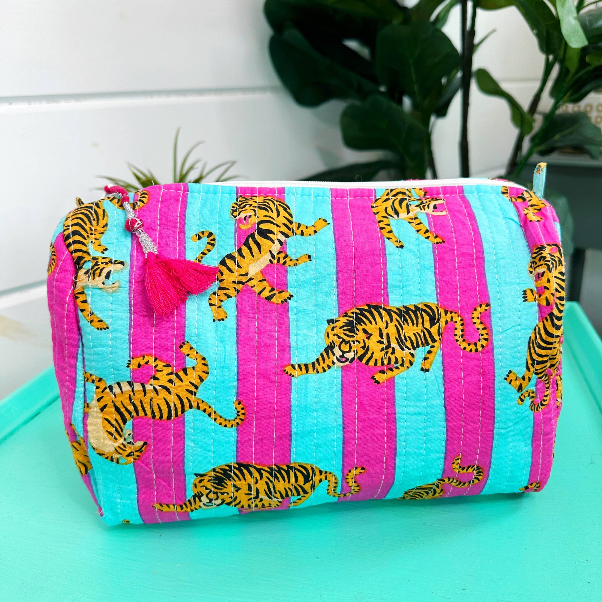 Experience our Handmade Magenta and Aqua Striped Tiger Print Quilted Travel Cosmetics Bag - perfect for on-the-go organization of beauty essentials and toiletries. With interior pockets and a tassel pull zipper, this functional bag has a unique design. Approx. dimensions: 10" x 8" x 6". Ideal for boutiques, gift shops, birthdays, embroidery blanks, and more! 100% cotton and hand block printed exterior, each bag is handmade by Indian artisans in small batches with unique print placements.