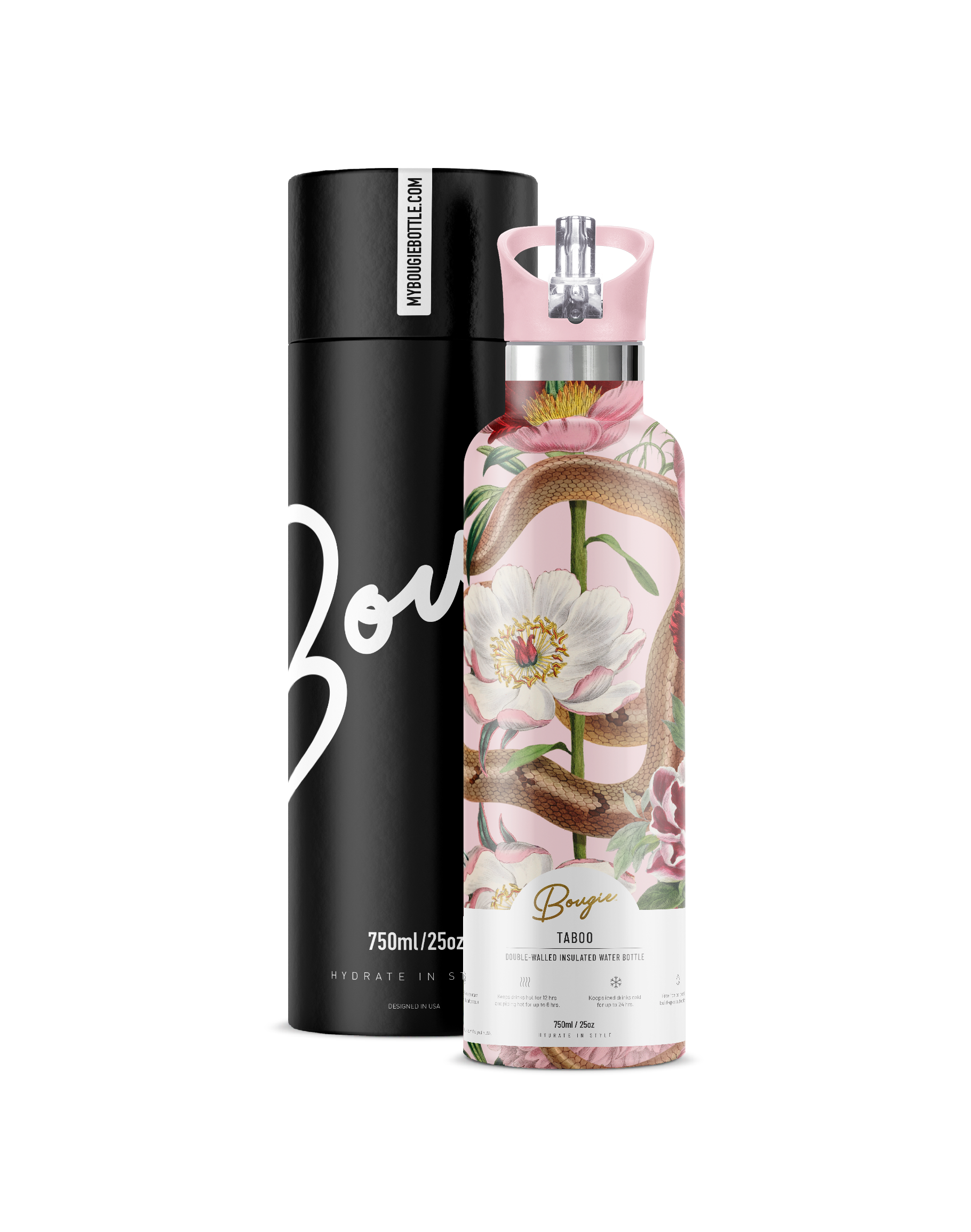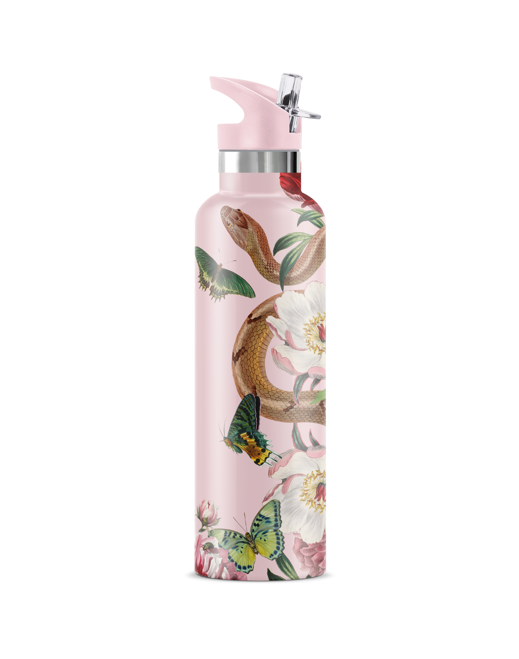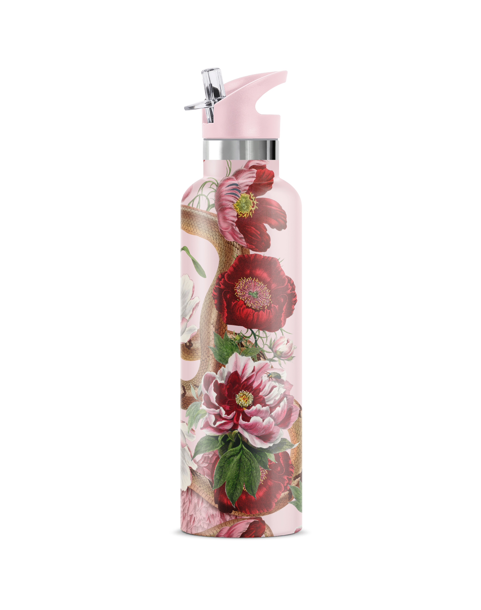 Stay refreshed in style with this 25 oz insulated water bottle inspired by snakes and flowers. Includes a leak-proof Flip 'n' Sip Lid and reusable BPA-free straws, and features a scratch-resistant graphic wrap, easy to carry handle, and double-walled insulation to keep drinks cold for up to 24hrs and hot for up to 12hrs. Eco-friendly and FDA approved. FUN FACT: It holds a full bottle of wine!