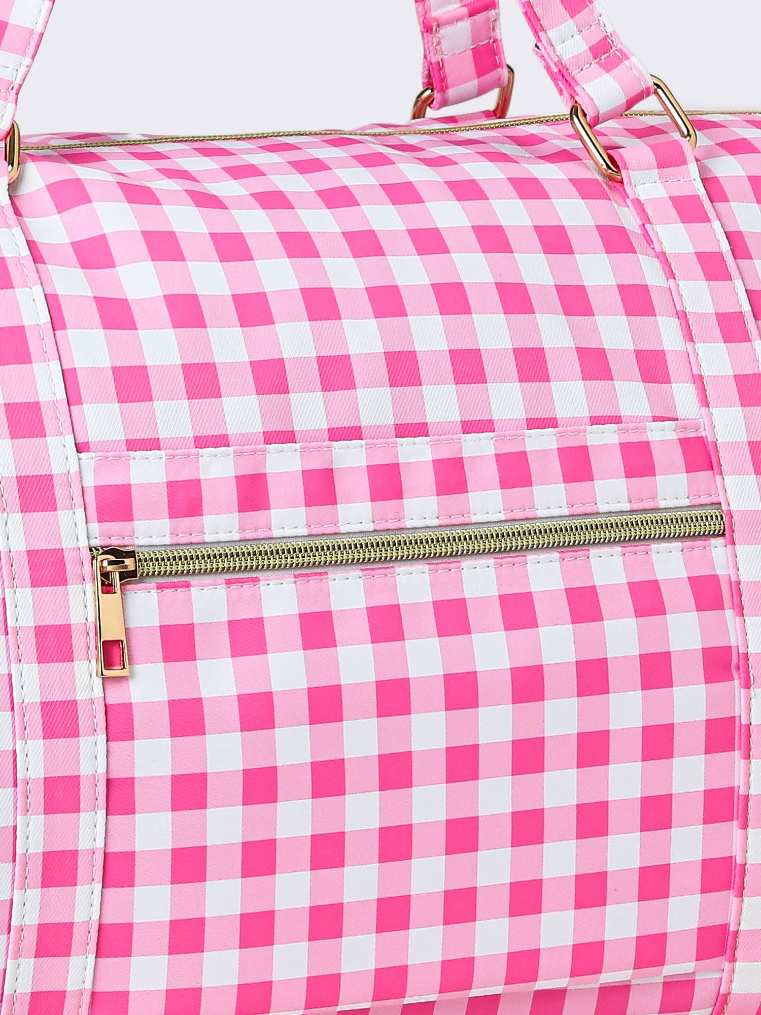 Travel in style and never worry about space with our Women Pink Checkered Canvas Travel Bag. Designed with a spacious interior, this bag provides both fashion and function for all your travel needs.