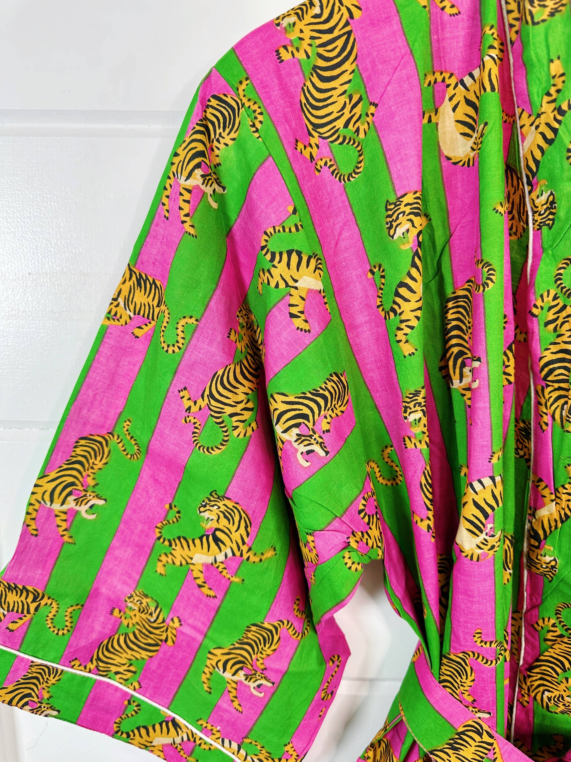 Stand out with this tiger print cotton kimono robe, expertly handcrafted by Indian artisans. Its lightweight, breathable fabric makes it ideal not only as a robe but also as a chic beach or poolside cover-up. Wear it over jeans and a tank for a stylish duster-layered look. Features include one size fits all, approximately 50" length from collar to hem, 3/4 length sleeves, handy front pockets, and a removable waist tie. Made from 100% cotton, each robe is hand block printed, ensuring unique variations and slight irregularities that add to its authentic charm.