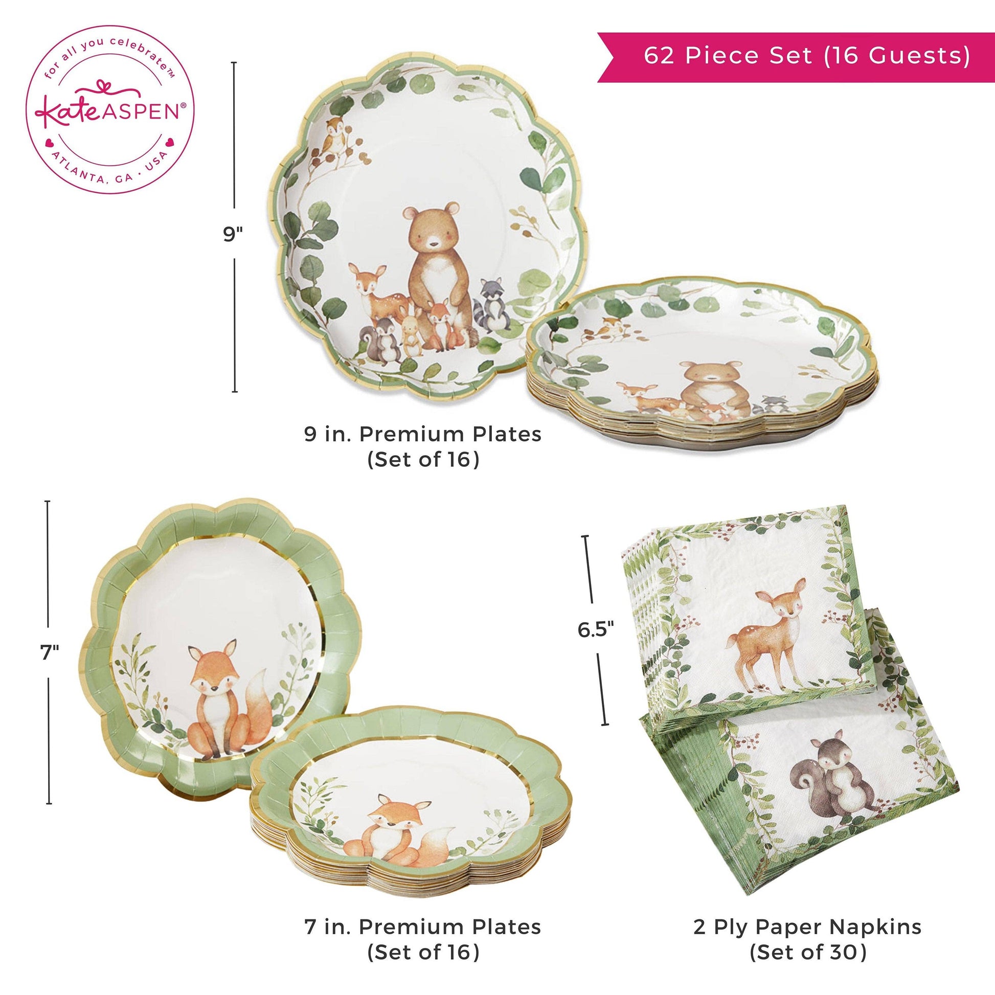 Our Woodland Baby 16 Guests (62 Piece) Party Tableware Set has been curated to be the perfect set for your next baby shower or child's birthday party. This set is not only great because you don't have to go looking for the perfect paper napkins or coordinating dessert plates because we have taken all the work out of that for you with this set, but we also design our collections to complement and coordinate flawlessly. They aren't just the same images in three different sizes. We are intentional about curating the perfect table setting. Our 9-inch plates display our 7-inch plates so well that it is hard to tell they are paper plates. The bold rim on the 9in plates perfectly showcase the scalloped edges and gold detail on the 7 inch plates.